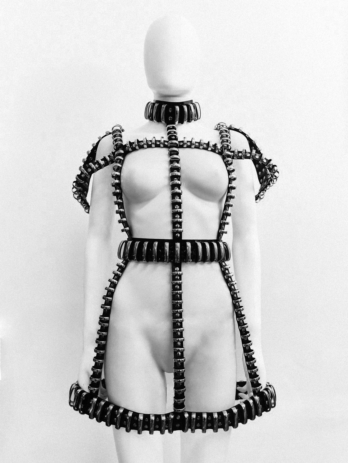 The stunning Jivomir Domoustchiev multi ring harness dress is created to order in a choice of stunning colours and trim. As featured in Harpers Bazaar China and Arabia Shown in black with gold tone rings also available with silver tone rings and buckles. contact@jivomirdomoustchiev.com Please allow three weeks for the creation of the custom dress. Designed as a homage to the collaboration between Jivomir Domoustchiev x Crazy Horse Paris