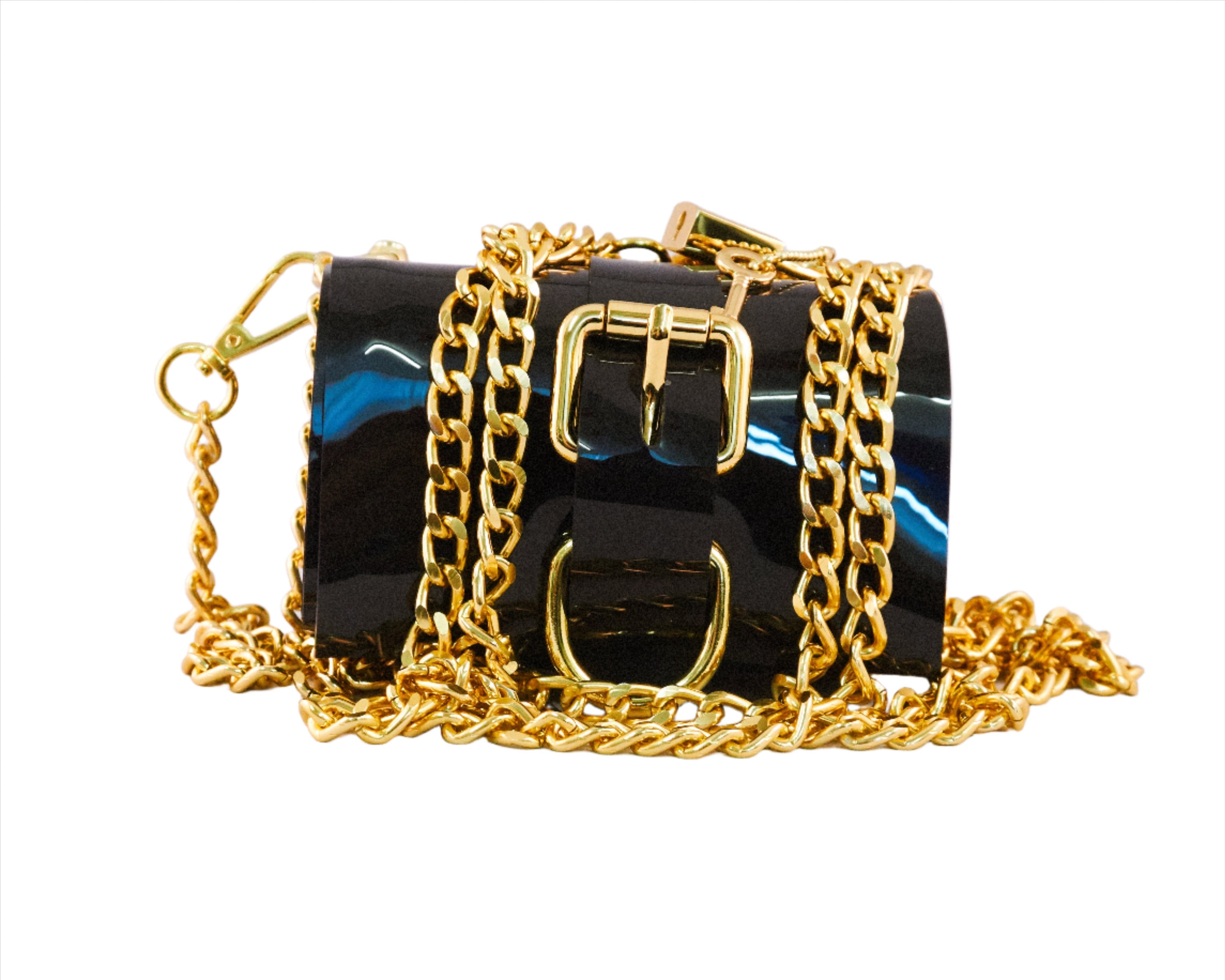 The all new 'The Secret' Bag - The Jivomir Domoustchiev must have small purse vegan vinyl handbag. Perfectly sized for secret pure essentials. Going out phone in hand . Jivomir reimagine's the purse and created the ultimate luxury accessory. The chain is extra long to be worn bellow the hip also in many different ways from over the shoulder to bum bag and is available in a variety of stunning collectible clear and solid colours contact@jivomirdomoustchiev.com. Finished in chrome silver look or gold tone look. Must Have luxury lovingly hand crafted in our East London workshop. Buy one or collect all colours makes the perfect accessory to complement any outfit. External dimensions MINI 125x80x80mm. Fits credit card + cash + Lipsticks and more.... £160
