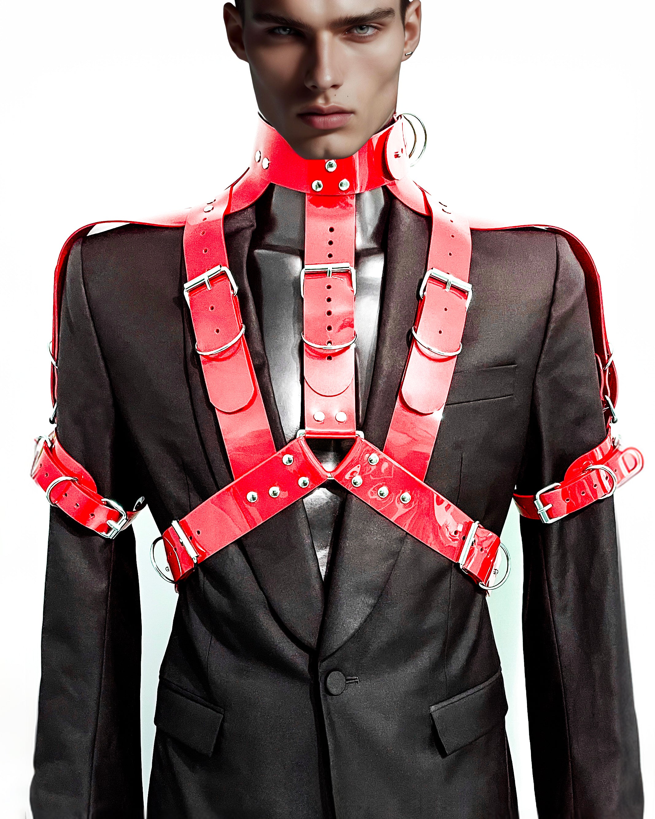The Full J Harness Set Jivomir Domoustchiev harness available to order in a variety of collectible colours. This must have harness can be warn over everything or by itself. With The JoC Strap you can style with your briefs of choice or wear bare. Complete an outfit and stand out. It is finished in silver tone buckles gold tone available upon request and studding and is fully adjustable. Made in a vegan vinyl in any of the colours we offer and also available in a matt bio vegan imitation leather strapping in Black only which some may find more comfortable if your not used to wearing vinyl or latex. As all Jivomir Domoustchiev pieces are hand crafted to order in our London atelier please allow up to 2 weeks for order dispatch. contact@jivomirdomoustchiev.com Please let us know your sizes including neck, chest, waist, hip, biceps, thigh measurement in the notes section at checkout. This piece is fully adjustable for comfort. The panels are 4cm wide for reference.